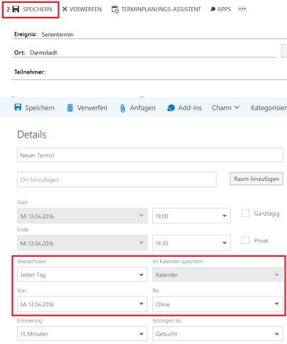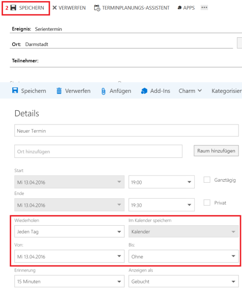 • Wichtig: Bitte setzen Sie eine Endebedigung (Anzahl Wiederholungen oder Enddatum). Dies ist insbesondere sinnvoll, wenn Sie andere Einladen oder einen Raum buchen.