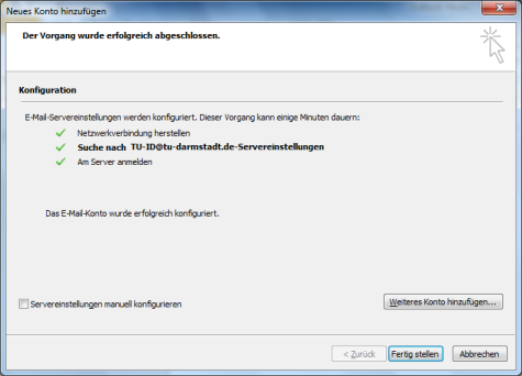 - Auf Vorgang abgeschlossen klicken. Sie können in Outlook nun Ihr Groupware Konto verwenden.
